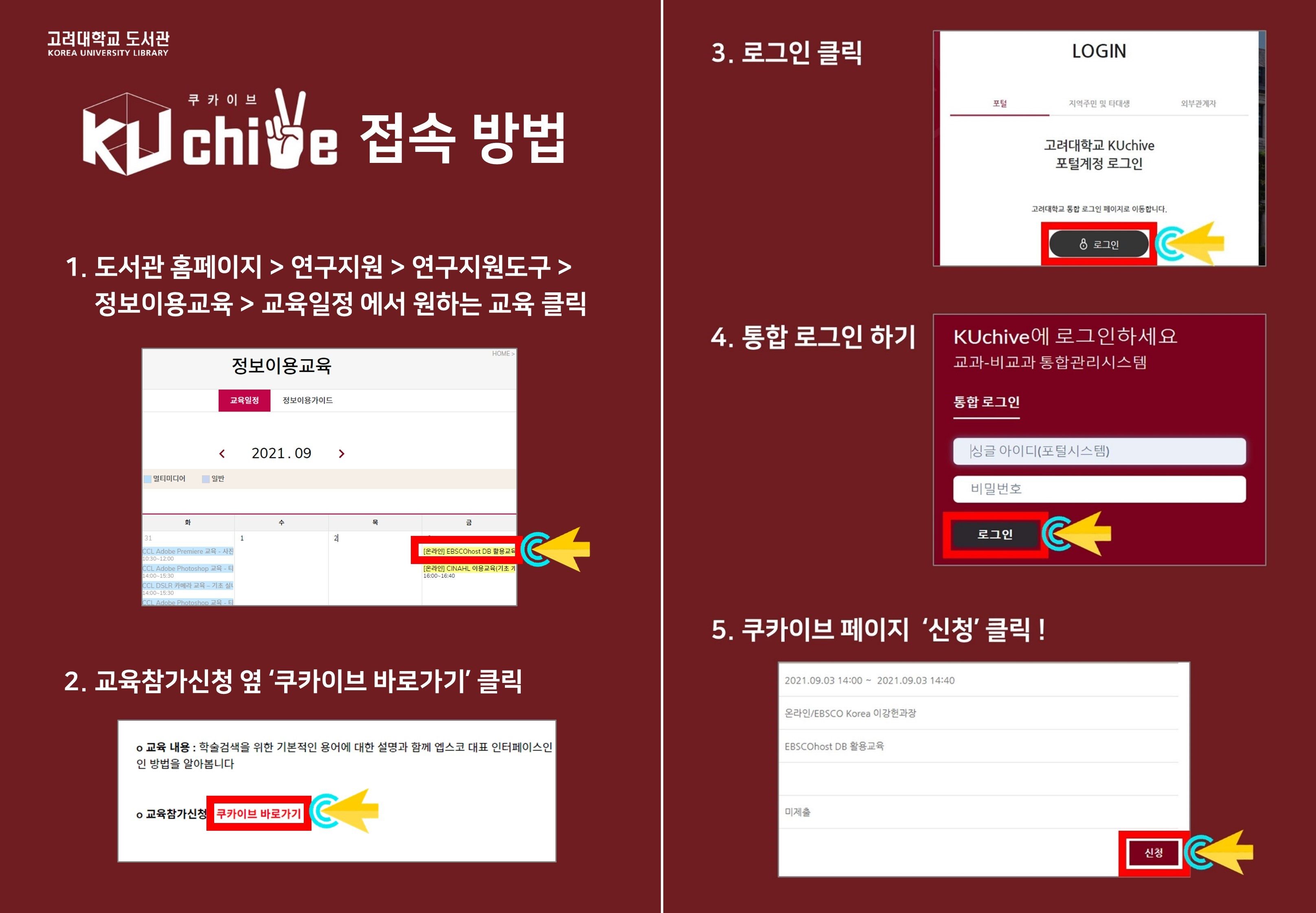 온라인이용교육에 참가를 원하는 분은 아래 '쿠카이브 바로가기'를 클릭한 후 쿠카이브에서 신청하시기 바랍니다.