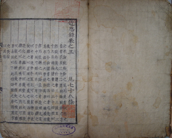 HOME > 자료이용 > 아카이빙 > 고서배접 > 고서배접 리스트 고서배접 이용안내 고서배접 과정 고서배접 리스트 近思錄集解 작성자 구자훈 이메일 dmafks@korea.ac.kr 작성일 2013-10-01 10:17 조회 1030 청구기호 만송 C1 A79P 3 등록번호 461379747 褙接 2011年 10月 全卷褙接(고려대) 복원전 복원후 Remarks 얼룩있고 푸석함. 지력이 약해져 있음. Attachments IMG1380590264665.jpg B031380590264669.jpg B021380590264668.jpg B011380590264667.jpg A031380590264671.jpg A021380590264670.jpg A011380590264669.jpg « 近思錄集解 資治通鑑綱目 » 목록보기