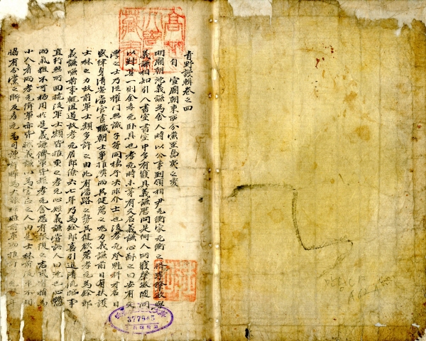 HOME > 자료이용 > 아카이빙 > 고서배접 > 고서배접 리스트 고서배접 이용안내 고서배접 과정 고서배접 리스트 靑野만輯 작성자 구자훈 이메일 dmafks@korea.ac.kr 작성일 2013-10-02 10:36 조회 1132 청구기호 만송 C12 A62A 4 등록번호 461377945 褙接 2013年 4月 全卷褙接(고려대) 복원전 복원후 Remarks 뒤쪽 30여페이지 썩고 삭아서 없어진 부분 많음. 솜처럼 푸석푸석하고 상태 매우 나쁨. 후표지 없음. Attachments IMG1380847606291.jpg B031380847606293.jpg B021380847606292.jpg B011380847606292.jpg A031380677828624.jpg A021380677828623.jpg A011380677828621.jpg « 資治通鑑綱目 詩傳大全 » 목록보기